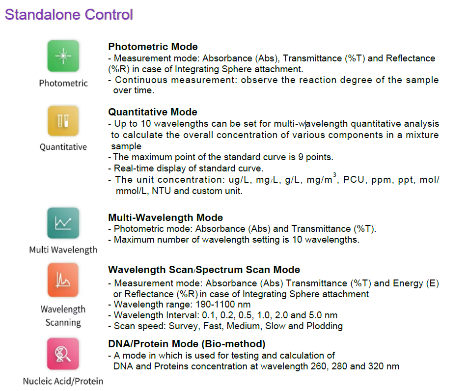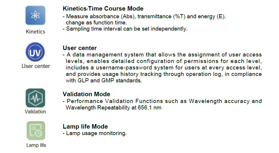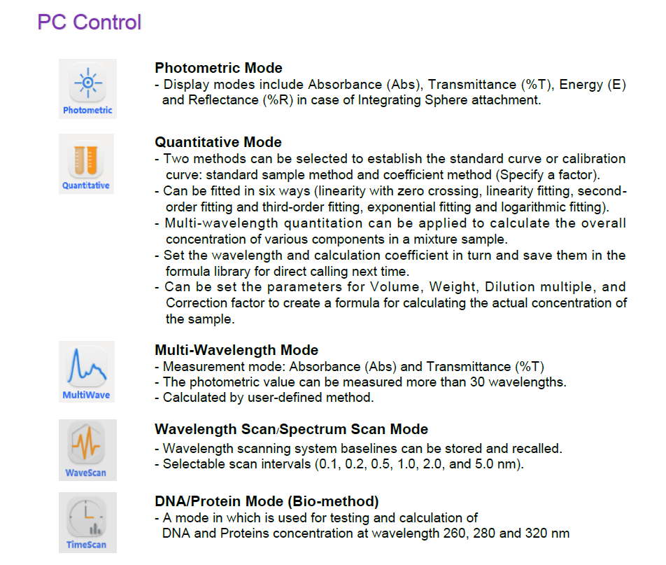 - Software function: Photometry, Wavelength Scan, Quantitative, Multi Wavelength, Kinetics (Time course), DNA/Protein, Custom formula etc.