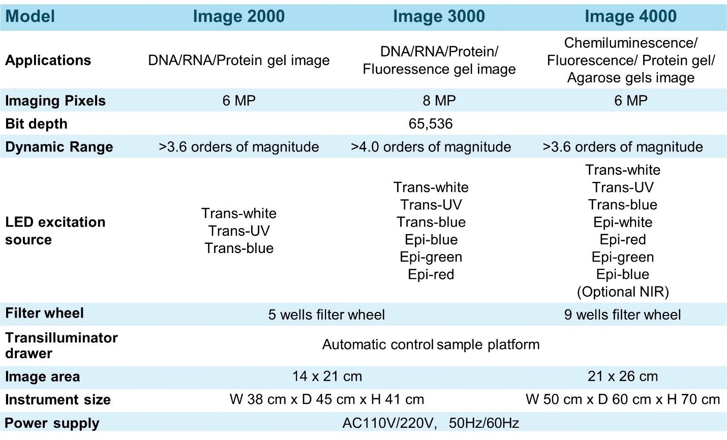 The Image 2000, Image 3000, and Image 4000 are multifunctional automatic gel documentation and analysis systems designed for reliable imaging of nucleic acids and proteins. The systems are suitable for a wide range of applications, including DNA and RNA gel imaging, SDS-PAGE protein gels, stain-free gels, colony imaging, and X-ray film imaging, supporting both colorimetric and fluorescent detection methods.
