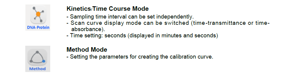- Software function: Photometry, Wavelength Scan, Quantitative, Multi Wavelength, Kinetics (Time course), DNA/Protein, Custom formula etc.